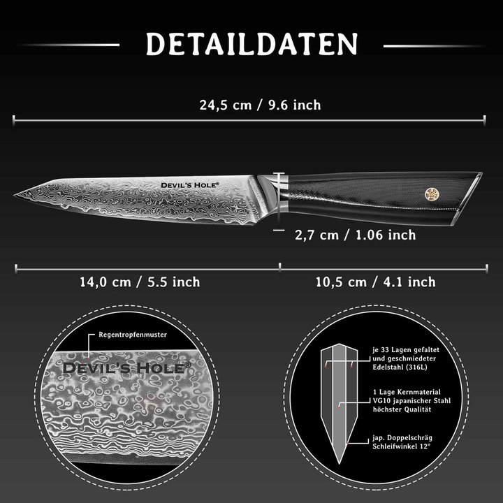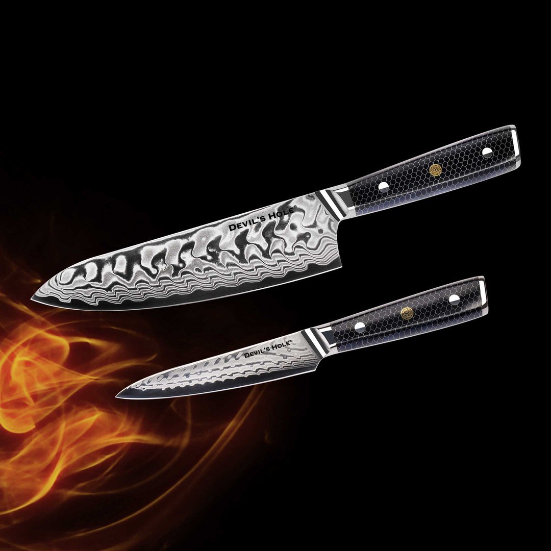 Für alle, die in der Küche höchste Präzision und Qualität schätzen, ist das exklusive Damastmesser Set von Devil’s Hole® die ideale Wahl. Es vereint Design, Funktion und Ergonomie in einem Set aus zwei Messern: einem 8-Zoll-Chefmesser und einem 5,5-Zoll-Universalmesser – perfekt als Starterset oder als Geschenk für ambitionierte Köche und Grillfans.