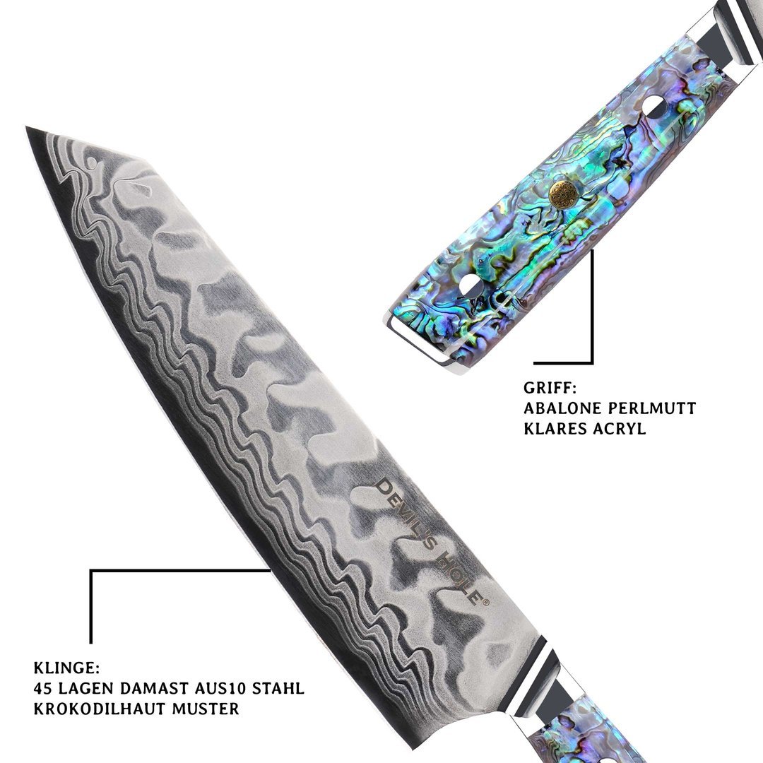 Besonders ins Auge fällt der Hybridgriff aus Acryl und echter Abalone-Muschel, dessen perlmuttartige Lichtreflexe bei jedem Lichteinfall anders schimmern. Die 13,5 cm lange Griffzone liegt ergonomisch perfekt in der Hand und macht das Messer zu einem visuellen Highlight in jeder Küche.