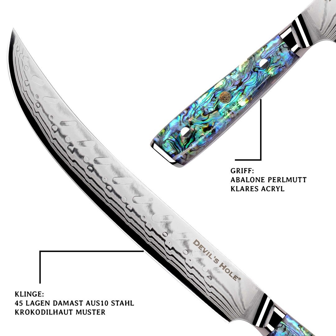 Grosses Zerlegemesser mit 45-lagiger Damaststahlklinge und edlem Hybridgriff aus Acryl & Abalone-Muschel. Ideal für Grob- und Feinzerlegung von Fleisch – ein Premium-Werkzeug für die Profiküche.