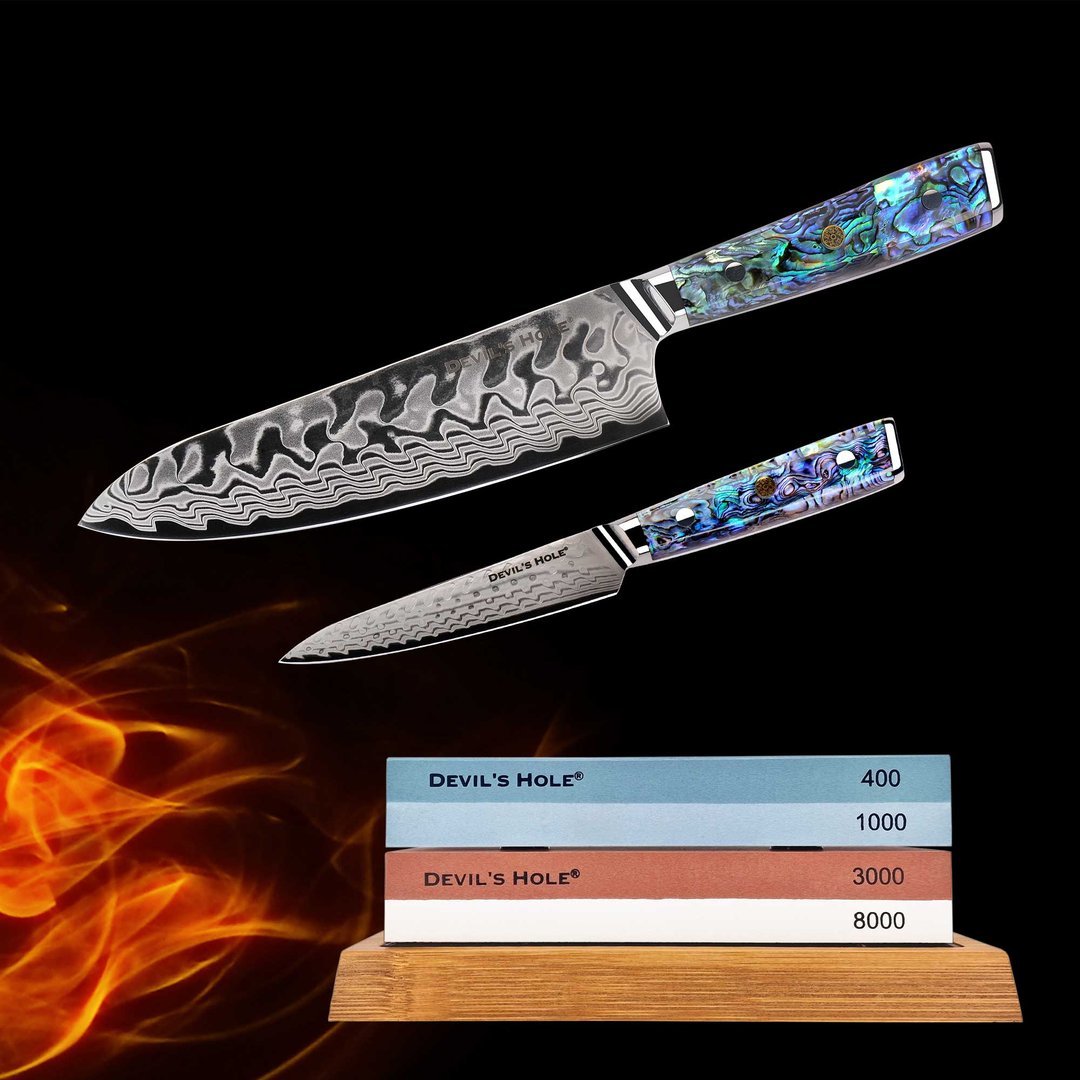 Premium Damastmesser-Set mit tiefblauem Abalone-Griff & Schleifstein-Komplettset – bestehend aus Chefmesser (8″), Universalmesser (5″) & doppelseitigen Schleifsteinen für messerscharfe Ergebnisse.