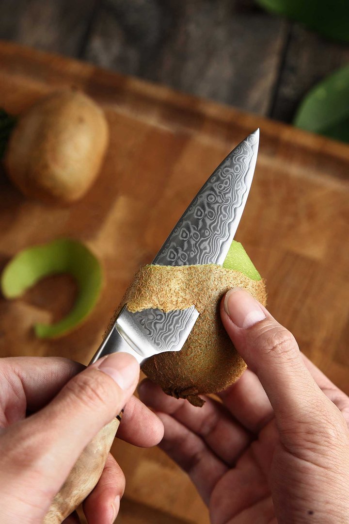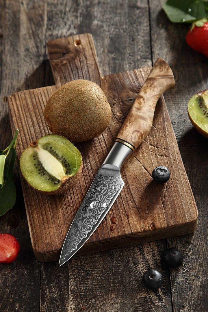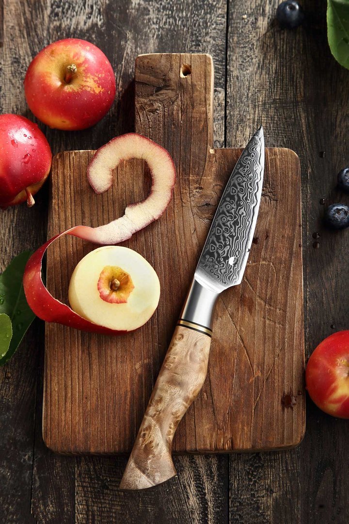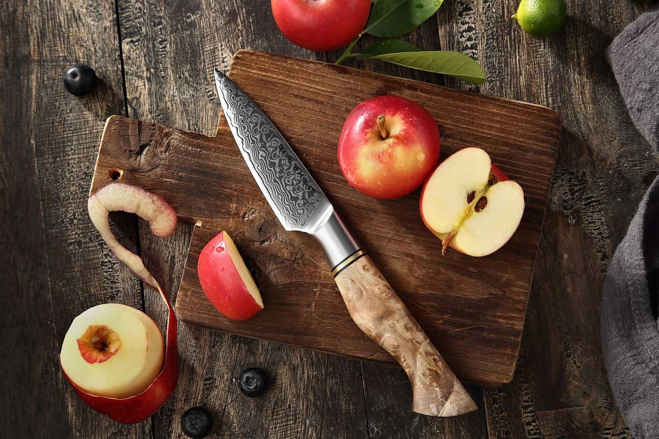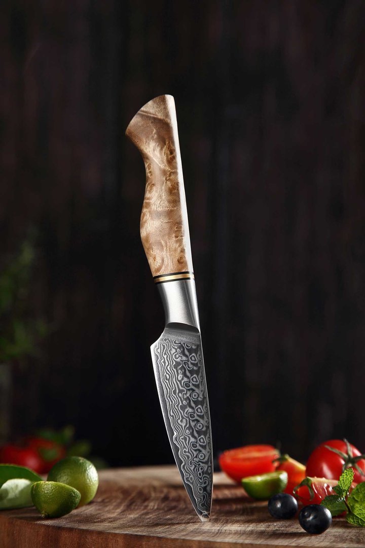 Kompaktes Küchenmesser mit 67-lagiger Damastklinge, extrem scharfem 15°-Schliff und ergonomischem Griff aus Bergahorn-Vollholz. Ideal zum Schälen, Schnitzen und Dekorieren von Obst und Gemüse.
