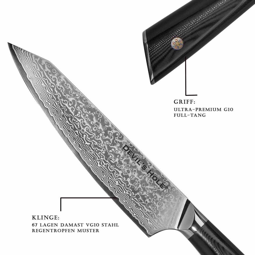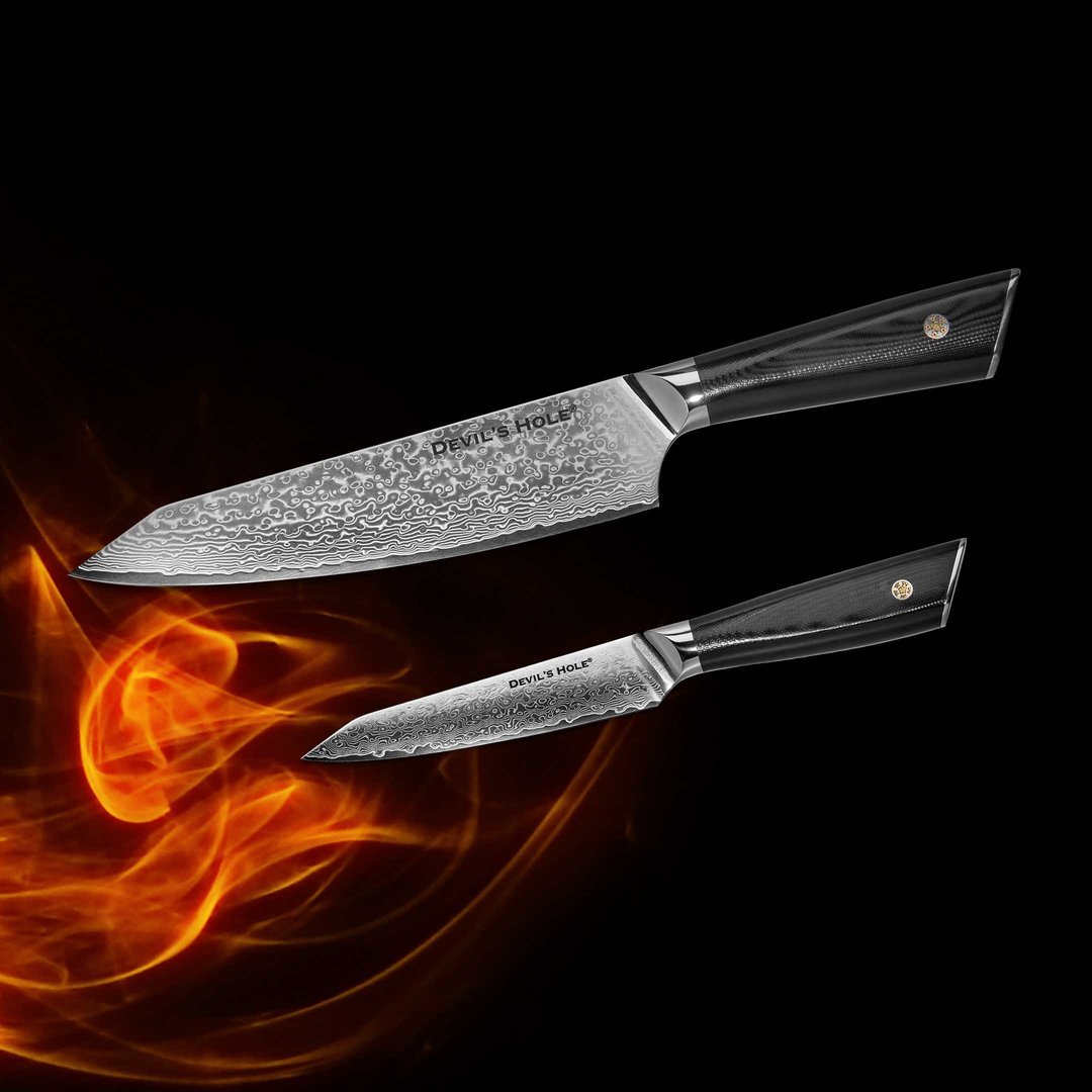 Exklusives 2-teiliges Damastmesser Set von Devil’s Hole® mit edlem schwarzem G10-Griff – bestehend aus Chefmesser (8″) und Universalmesser (5,5″). Präzision trifft auf Stil und Robustheit für höchste Ansprüche in der Küche.
