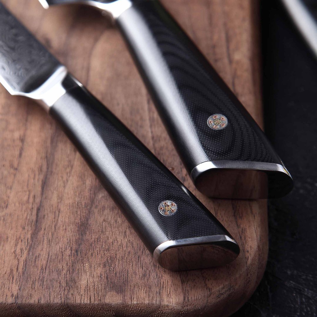 Die 67-lagige Damastklinge mit hochwertigem japanischem VG10-Stahlkern ist mit einem exquisiten Regentropfen-Muster versehen. Sie wurde von Hand mit der traditionellen 3-Stufen-Honbazuke-Methode auf einen 12°-Winkel geschliffen – für maximale Schärfe, Sicherheit und Schnittpräzision. Die Stickstoff-Härtung sorgt für aussergewöhnliche Festigkeit und Fleckenbeständigkeit.