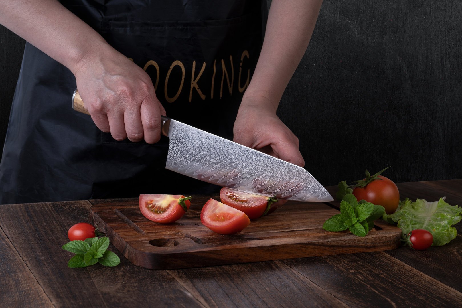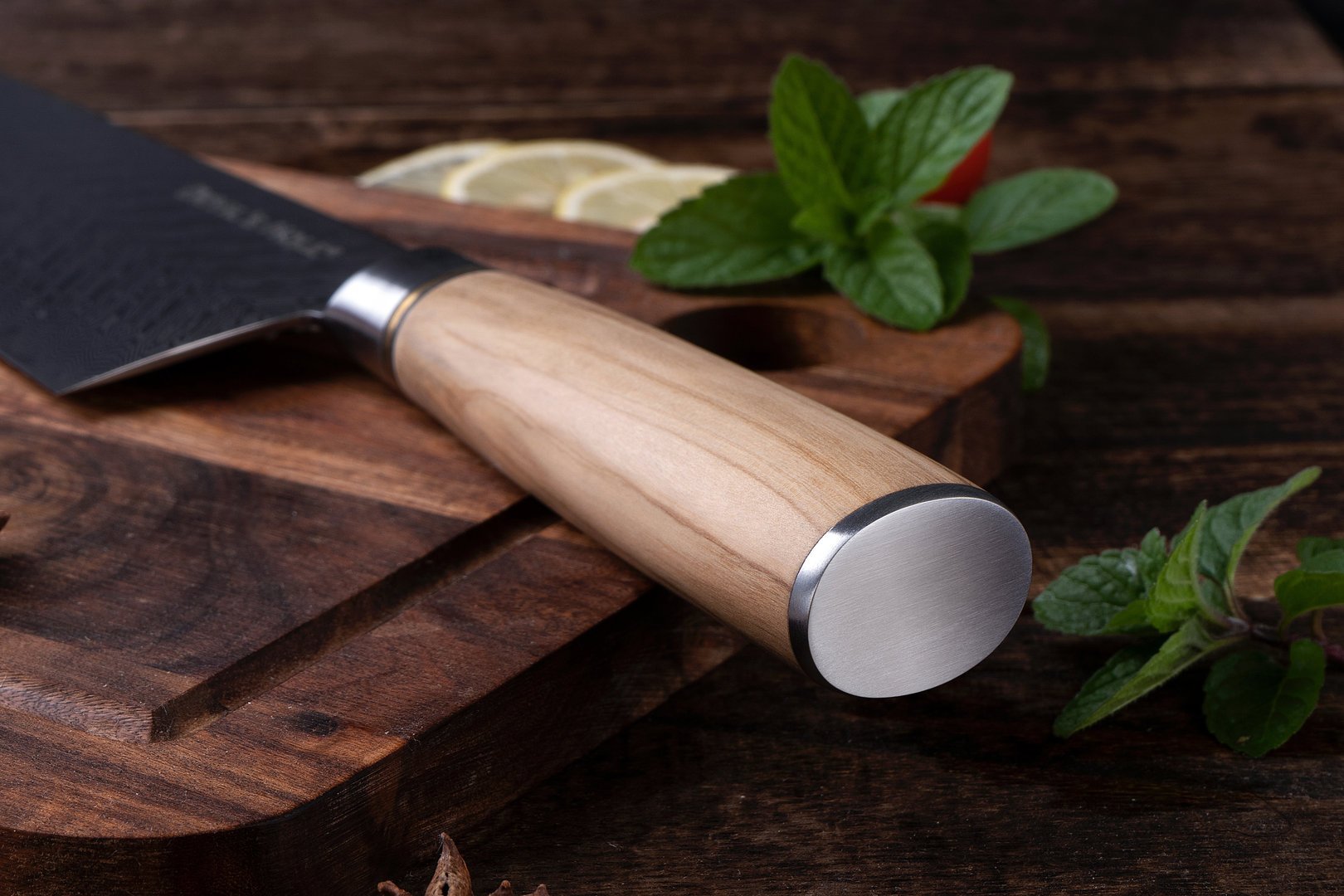 Exklusives Küchenmesser im japanischen Stil mit mediterranem Olivenholzgriff.