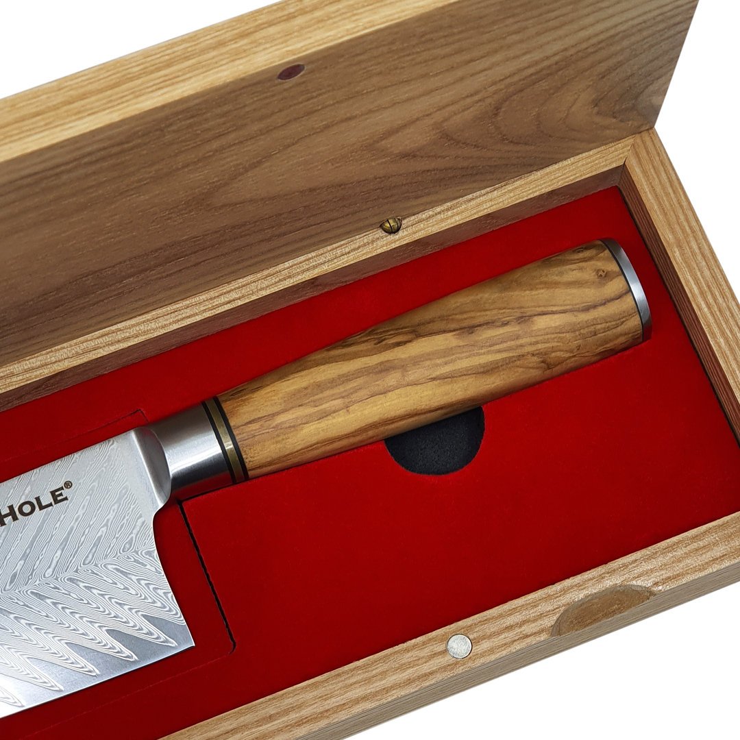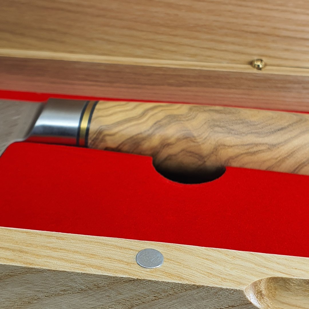 Geliefert wird das Messer in einer stabilen Geschenkbox aus Eschenholz mit Magnetschliesse. Die Esche ist besonders hart, langlebig und macht das Set auch optisch zu einem echten Hingucker. Mit einer individuellen Gravur wird es zum stilvollen Geschenk für Küche, Unternehmen oder Events.
