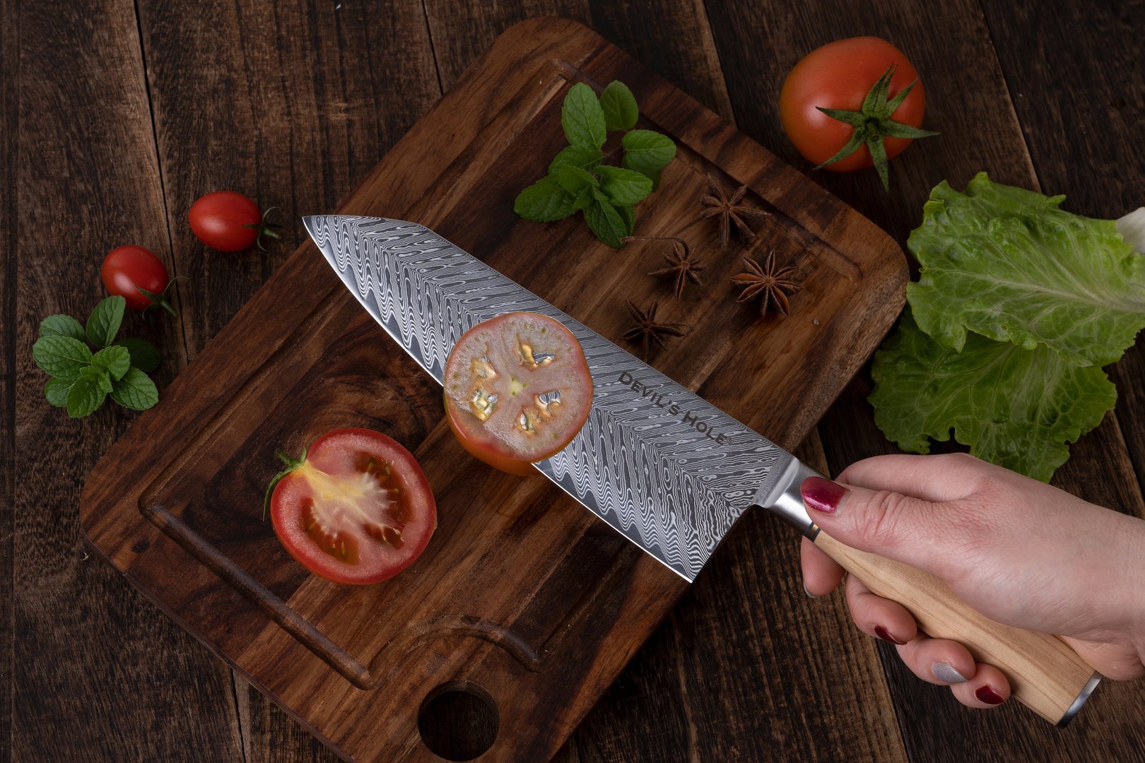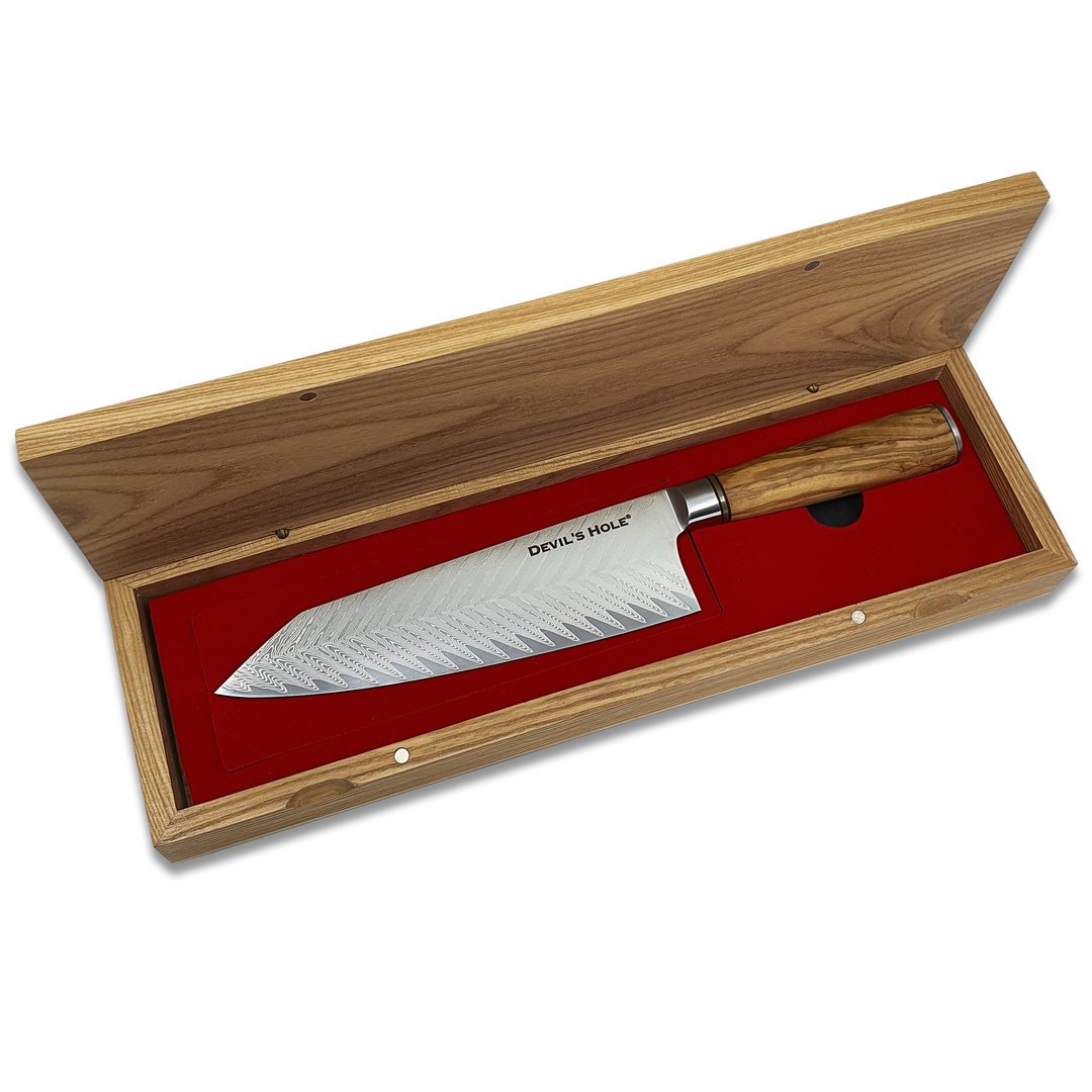 Höchste japanische Schmiedekunst trifft mediterranes Flair: Das 67-lagige Damastmesser von Devil’s Hole® kombiniert Eleganz, Funktion und Individualität.