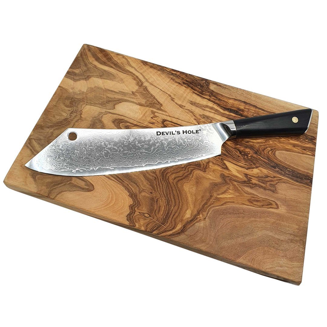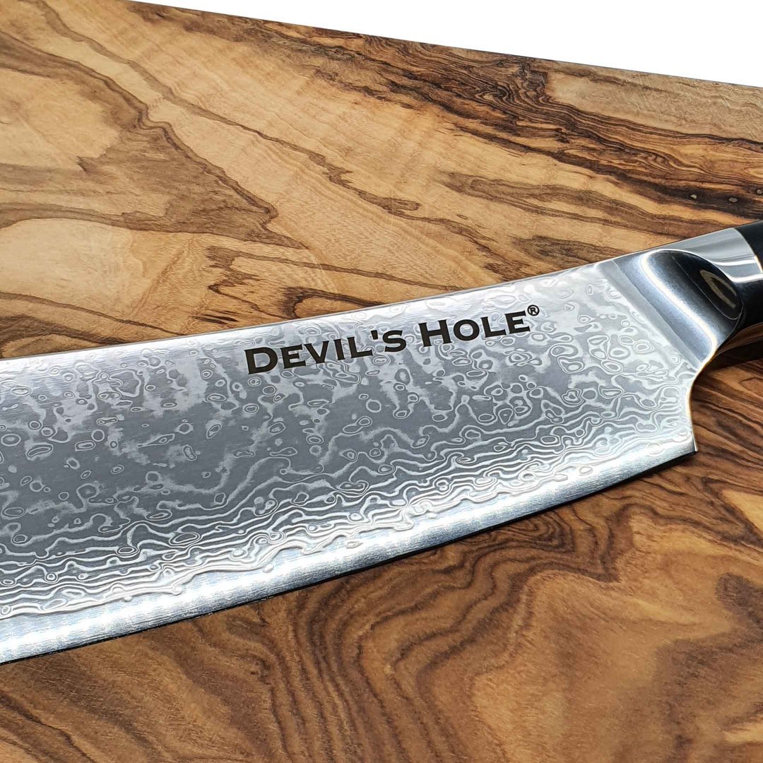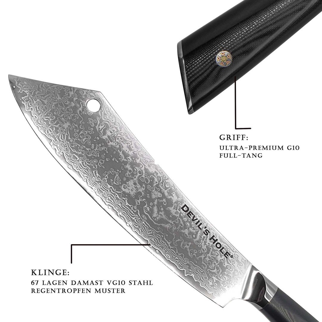 Das 9,5 Zoll Chefmesser von Devil’s Hole® ist die perfekte Wahl für anspruchsvolle Köche, die Wert auf außergewöhnliche Schärfe, edles Design und langlebige Qualität legen. Mit einer imposanten Klingenlänge von 24 cm meistert dieses Messer souverän alle Schneidarbeiten: vom feinen Wiegen von Kräutern bis zum Tranchieren großer Fleischstücke.