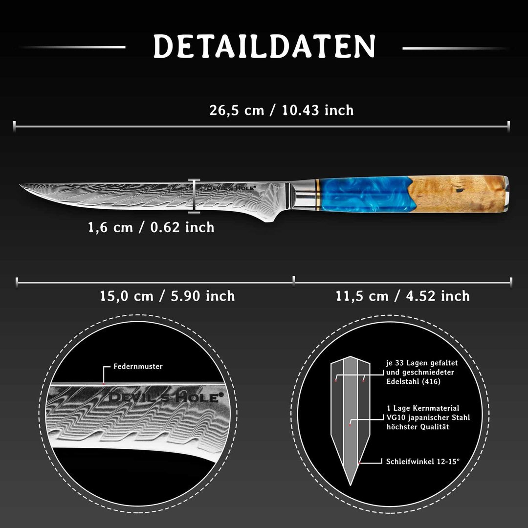 Das Filetiermesser „Deep Blue“ von Devil’s Hole® ist die perfekte Wahl für feine Schneidarbeiten an Fleisch und Fisch. Mit seiner schlanken, biegsamen Klinge ermöglicht es das mühelose Trennen von Haut, Sehnen oder Knochen – ganz ohne Verschnitt.