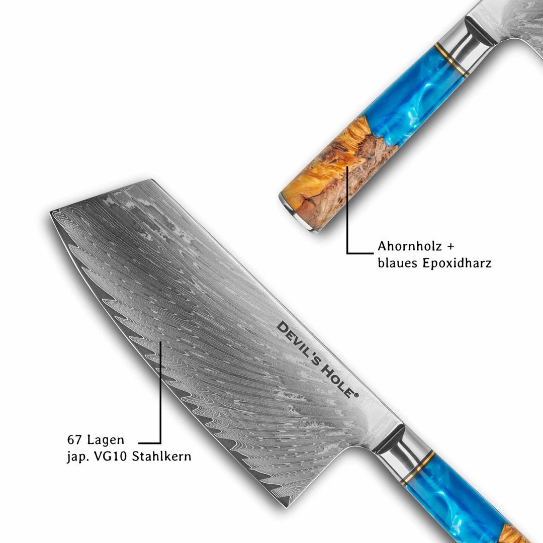 Visuelles Highlight: der Hybridgriff aus stabilem Ahornholz und tiefblauem Epoxidharz. Die Wellenstruktur erinnert an das Element Wasser – ein Symbol für Bewegung, Klarheit und Frische. Ergonomisch geformt, kraftvoll im Schnitt und wunderschön im Design – ein Muss für anspruchsvolle Küchenliebhaber.