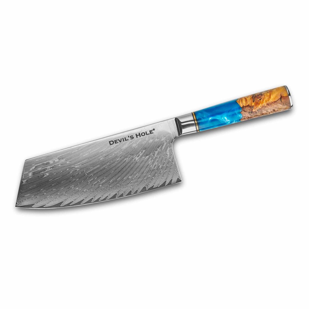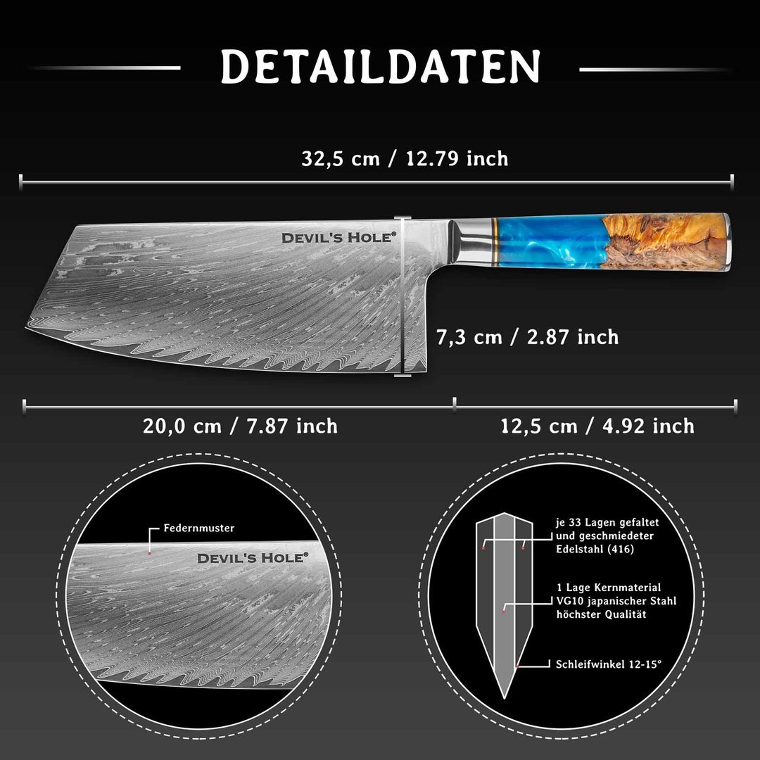 Das „Chai Dao“ Damastmesser von Devil’s Hole® ist ein Meisterwerk für jede Küche, in der Schnelligkeit, Präzision und Stil gefragt sind. Inspiriert von der fernöstlichen Kochtradition ist es als universelles Hack- und Schneidemesser konzipiert – ideal für feines Gemüse, hartschalige Früchte oder Kräuter.