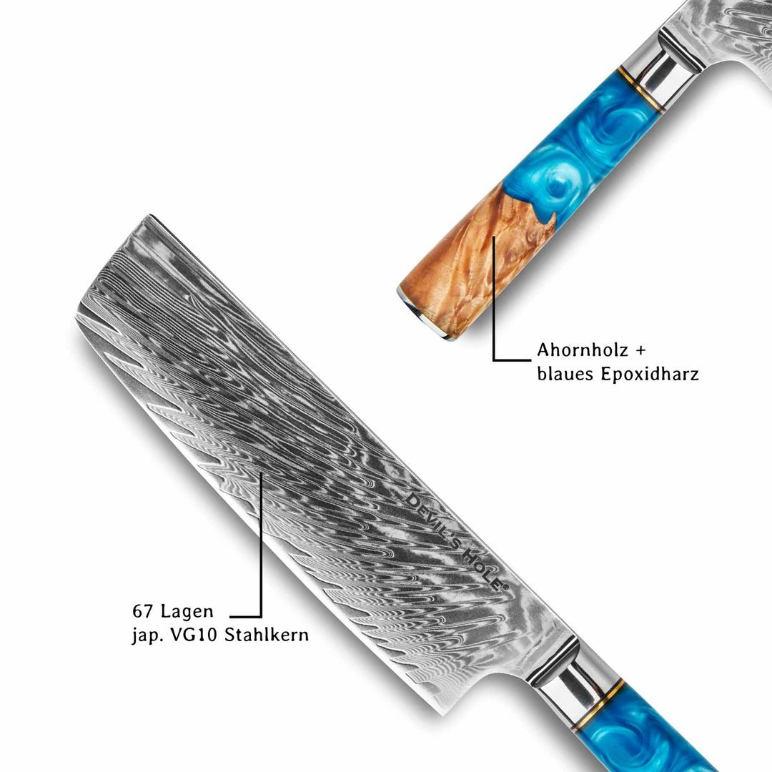 67 Lagen Damaststahl mit VG10-Kern, extra scharf geschliffen und ausgestattet mit einem blauen Epoxidharz-Ahornholzgriff – das perfekte Küchenmesser für Gemüse.