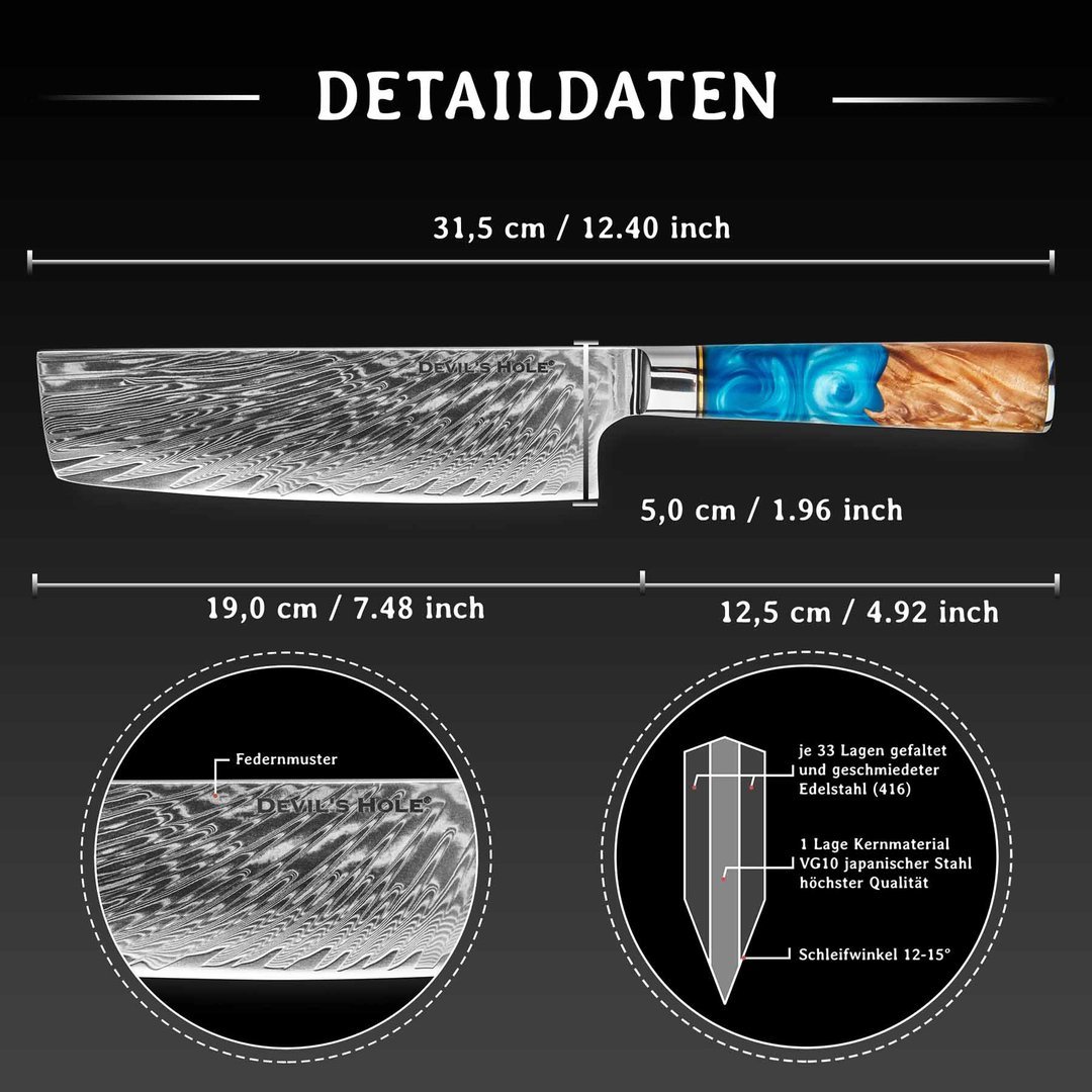 Das Nakiri Damastmesser aus der Deep Blue Serie ist das ideale Werkzeug für alle, die Gemüse nicht nur schneiden, sondern zelebrieren wollen. Die 19 cm lange Klinge besteht aus 67 Lagen Damaststahl mit einem VG10-Stahlkern, geschmiedet mit je 33 Lagen Edelstahl (416) pro Seite.