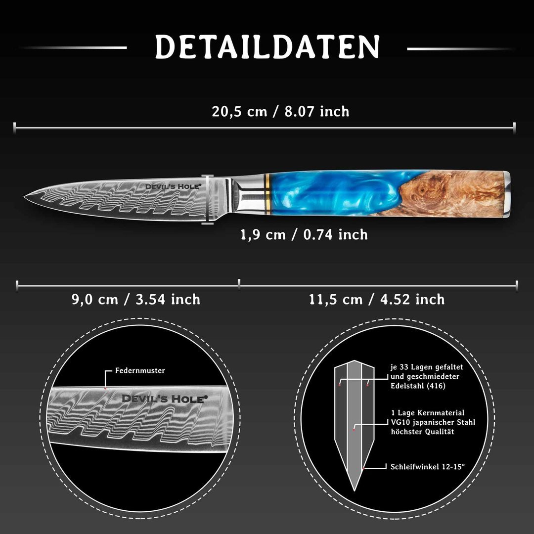 Das „Deep Blue“ Schälmesser von Devil’s Hole® ist der ideale Begleiter für präzise Schneidarbeiten in der Küche. Ob Schälen, Schnitzen oder Tournieren – mit der scharfen, handlichen 9 cm Klinge gelingt jede filigrane Aufgabe mühelos.