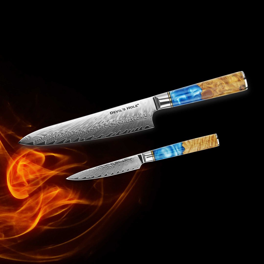 Elegantes Damastmesser-Set mit tiefblauem Epoxid-/Ahornholzgriff – bestehend aus Chefmesser (8″) & Universalmesser (5″). Perfekte Kombination aus Design, Schärfe und Vielseitigkeit für stilbewusste Köche.