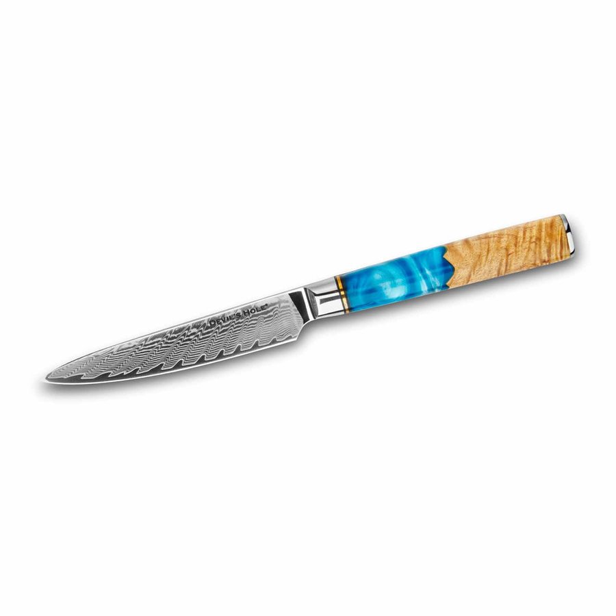 Die Griffe bestehen aus einem kunstvoll verarbeiteten Hybrid aus tiefblauem Epoxidharz und Ahornholz, das in fließenden Übergängen eine wellenartige Optik erzeugt. Jeder Griff ist ein Unikat mit individuellem Maserungsverlauf – ein echter Blickfang auf jedem Schneidebrett.