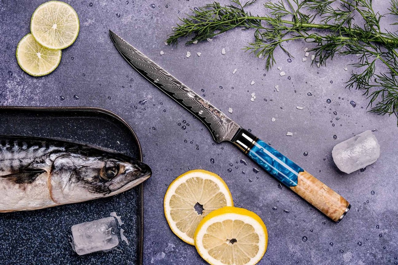 Exklusives Messerset mit 67-lagigem Damaststahl, VG10-Stahlkern und edlen Hybridgriffen aus Ahorn & tiefblauem Epoxidharz. Für professionelle Vielseitigkeit, Ästhetik und höchste Präzision.