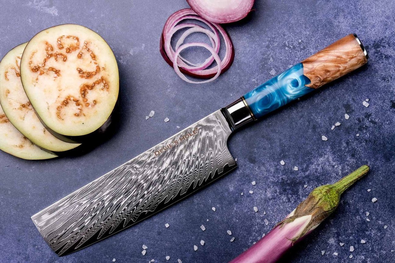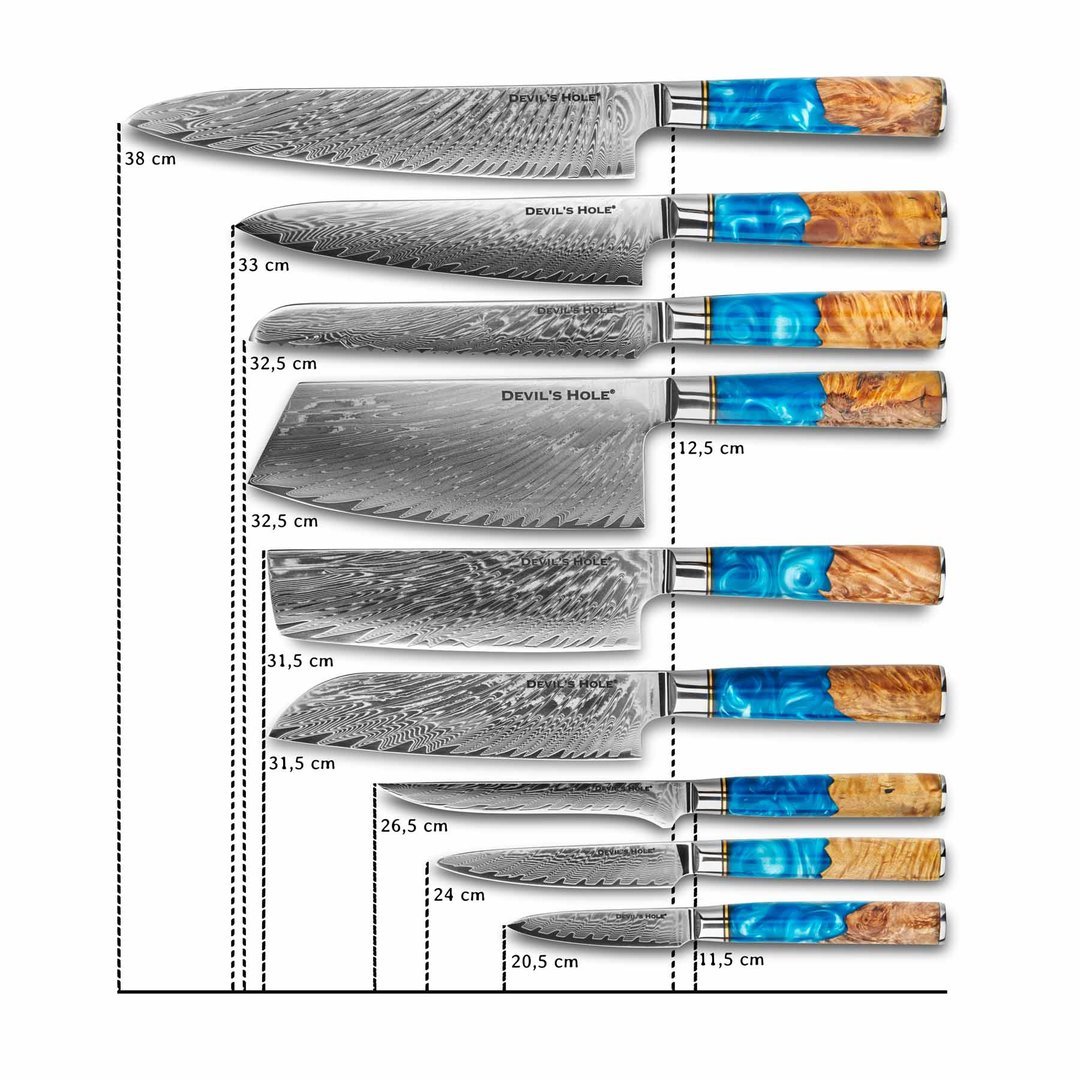 Das 9-teilige Profi Damastmesser-Set „Deep Blue“ von Devil’s Hole® vereint Funktion, Design und Handwerkskunst in einem einzigartigen Gesamtpaket. Für Köche, die keine Kompromisse eingehen, bietet dieses Set für jede Schneidaufgabe das passende Spezialwerkzeug – vom robusten Hackmesser bis zum feinen Tourniermesser.