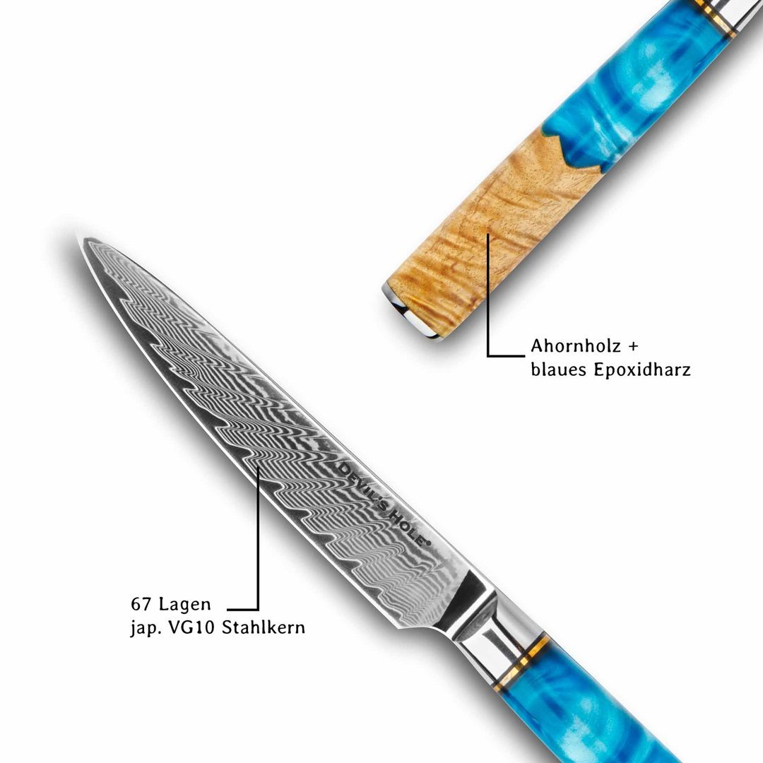 Kompaktes Damastmesser mit 67 Lagen Stahl und ergonomischem Hybridgriff aus Ahornholz & Deep Blue Epoxidharz. Ideal für alle Schneidarbeiten – von Gemüse bis Fleisch.