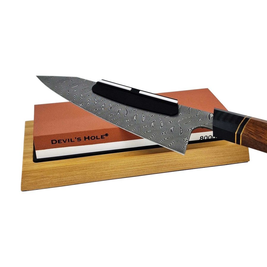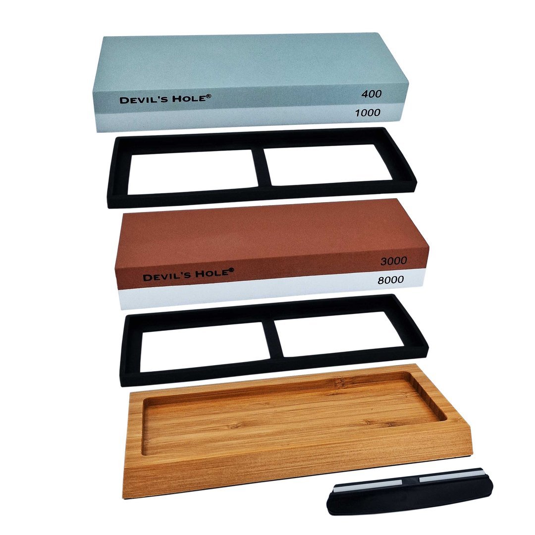 Professionelles Nassschleifstein-Set mit vier Körnungen für Grob-, Fein- und Polierschliff – inkl. Bambusbasis, Winkelhilfe und Gummihalter. Perfekt für neue & alte Küchenmesser.