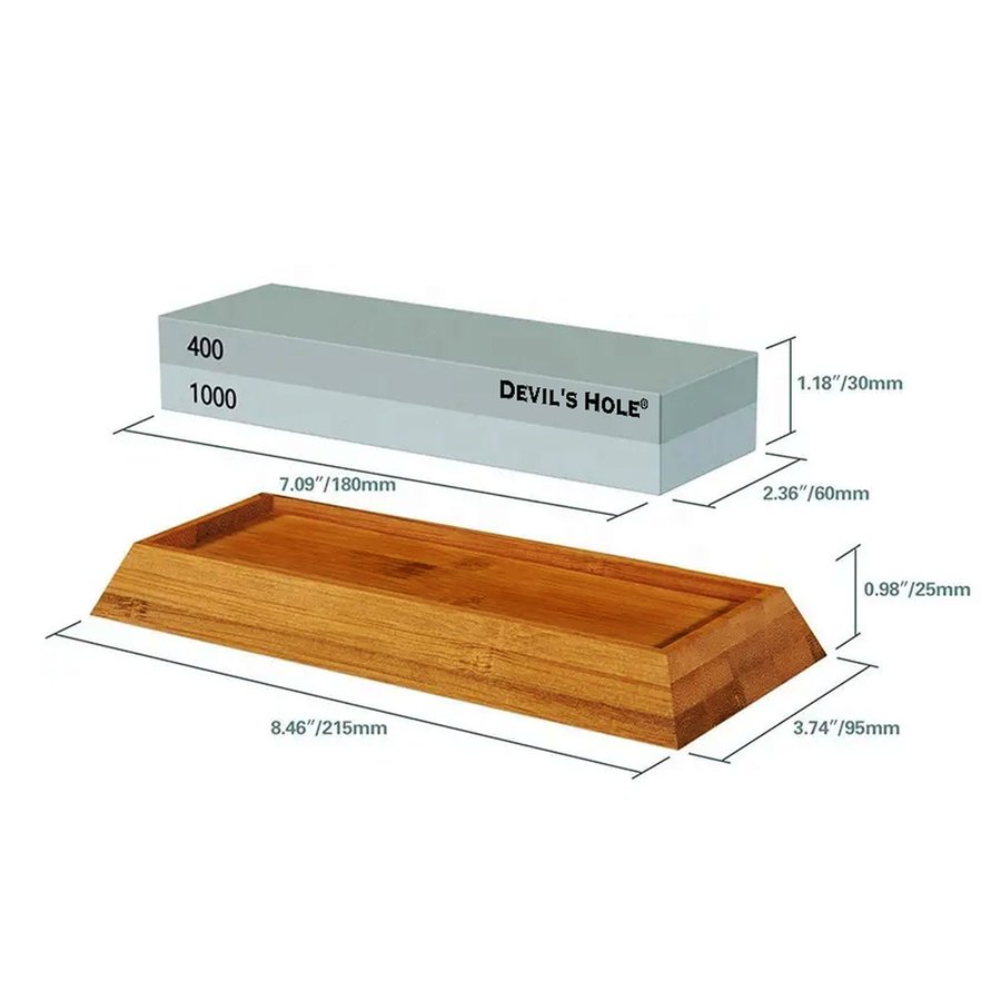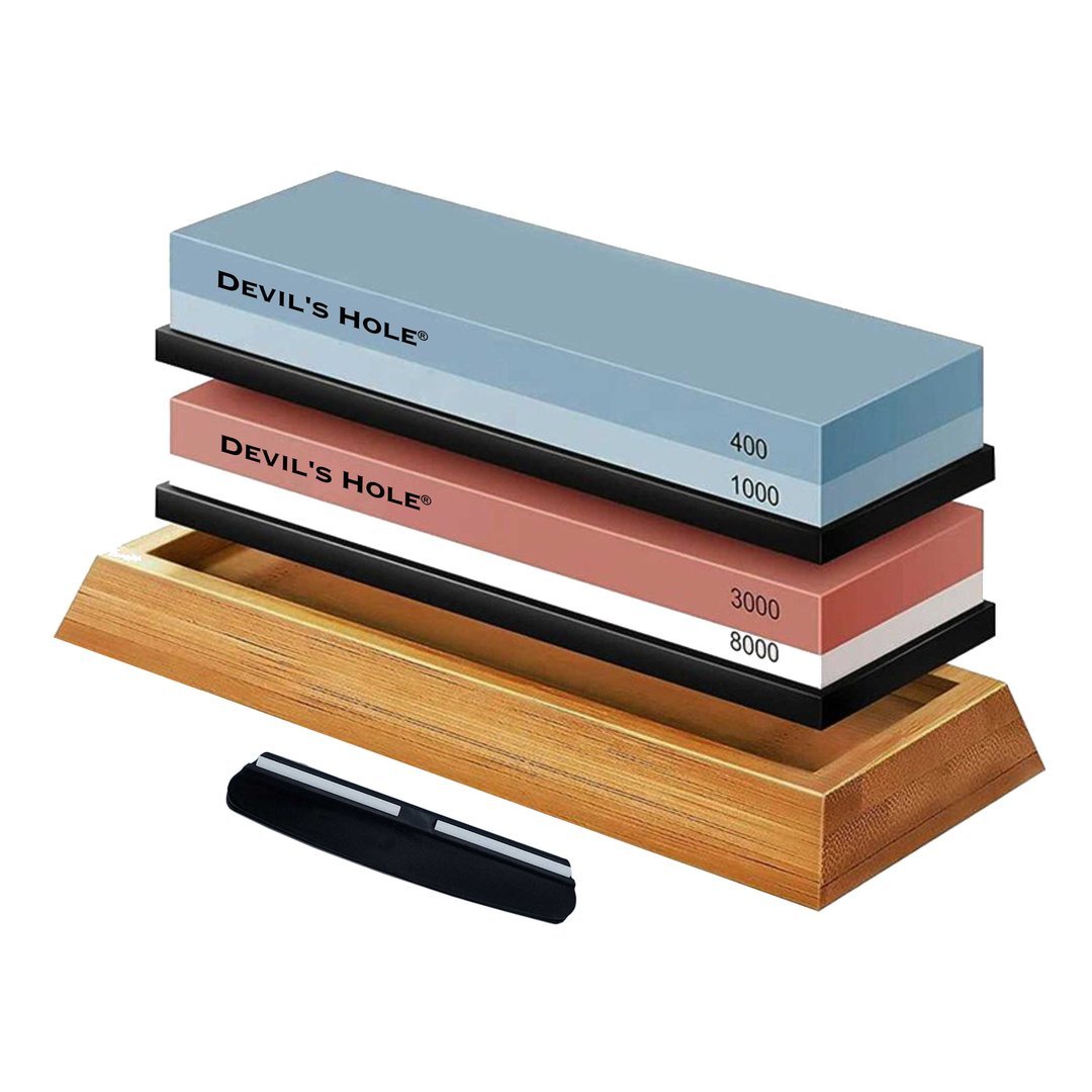 Dieses hochwertige 2-in-1 Schleifstein Set bringt stumpfe Messer wieder in Topform und erhält die Schärfe deiner neuen Klingen. Mit insgesamt vier Körnungsstufen – 400, 1000, 3000 und 8000 – lassen sich Küchenmesser optimal bearbeiten: vom Grobschliff bis hin zur finalen Spiegelpolitur.
