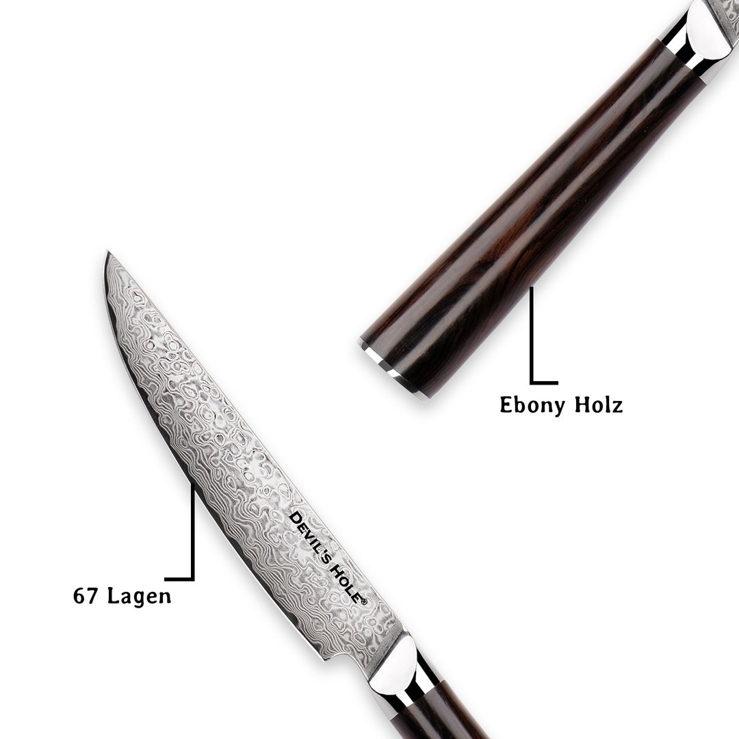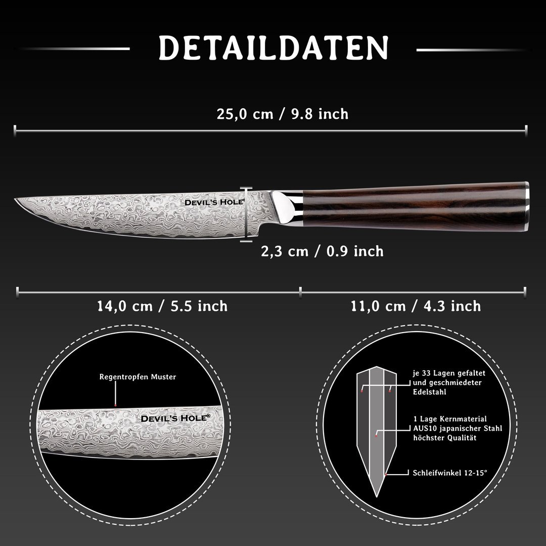 Das Damast Steakmesser von Devil’s Hole® ist ein echtes Highlight für jede stilvoll gedeckte Tafel. Speziell entwickelt für perfekt gegarte Steaks mit krosser Kruste und zartem Kern, schneidet es mühelos durch das Fleisch – ohne Reißen oder Ausfransen der Fasern wie bei einem klassischen Wellenschliffmesser. So bleibt der Fleischsaft erhalten und das Genusserlebnis unverfälscht.