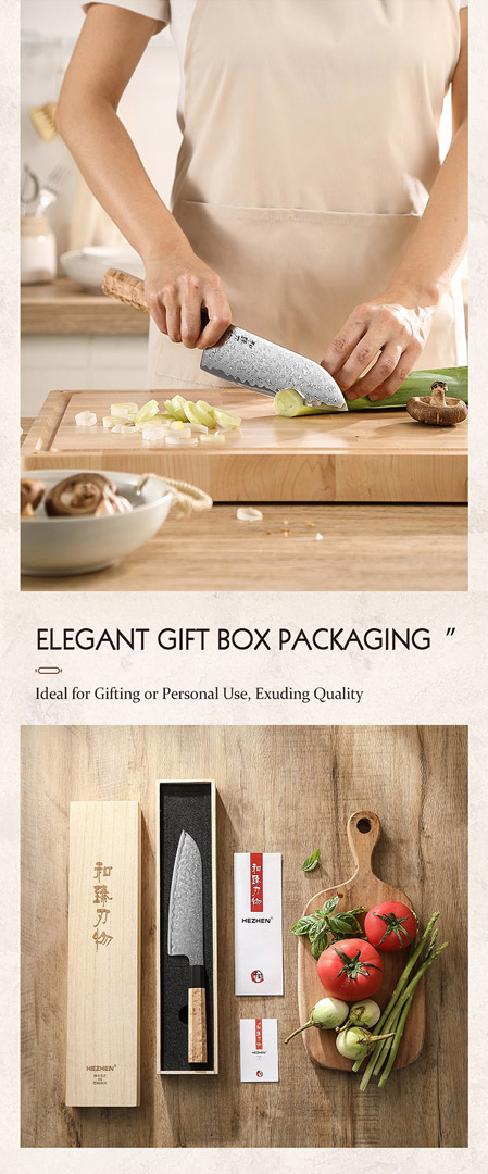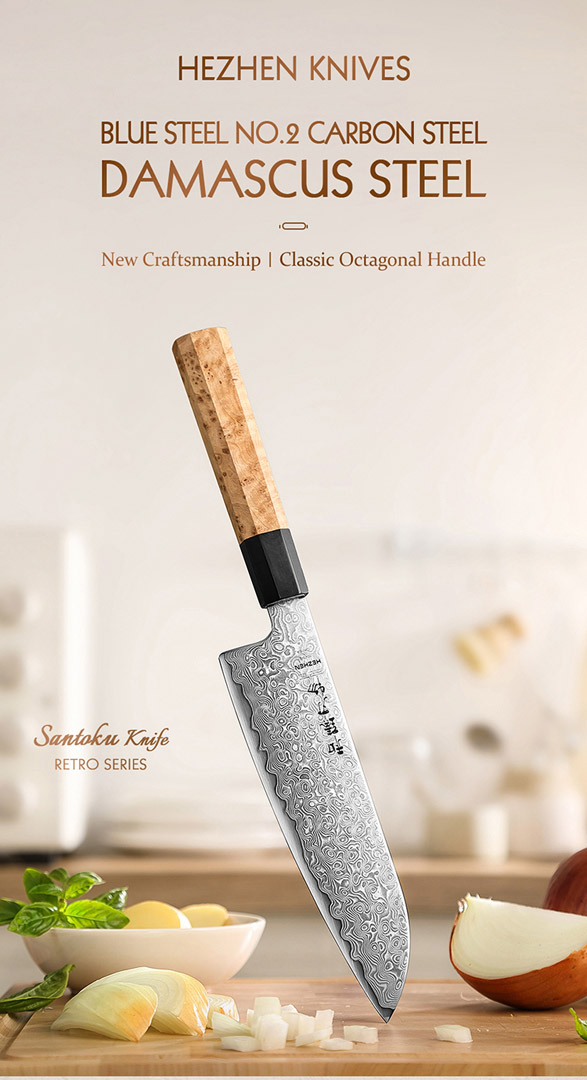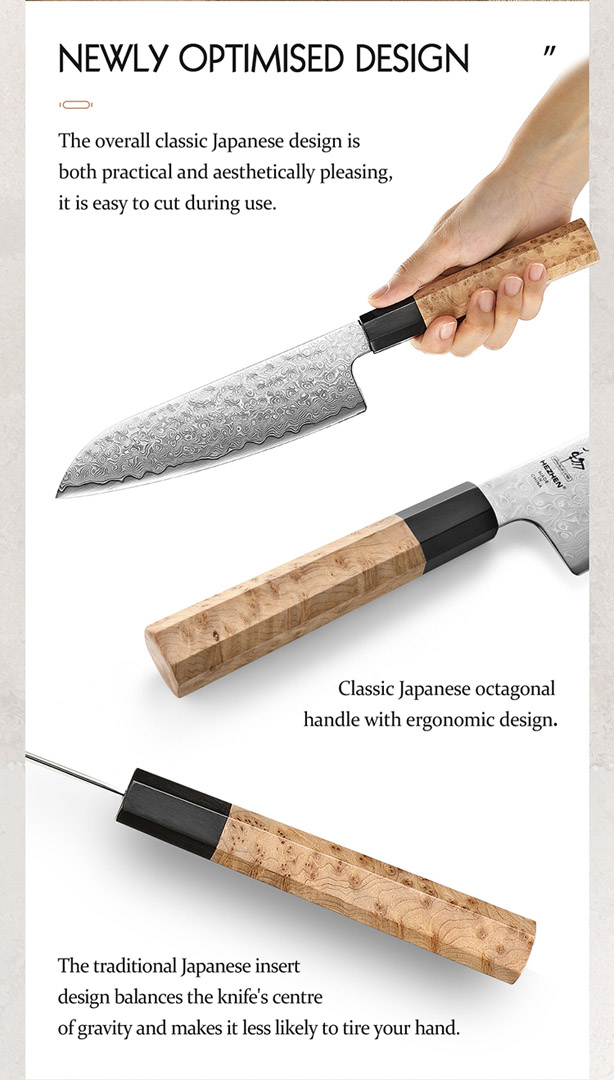 Elegantes 7.5“ Santokumesser mit 49-lagiger Damaststahlklinge und klassischem achteckigen Griff aus Maser-Ahorn – japanische Handwerkskunst für höchste Präzision.