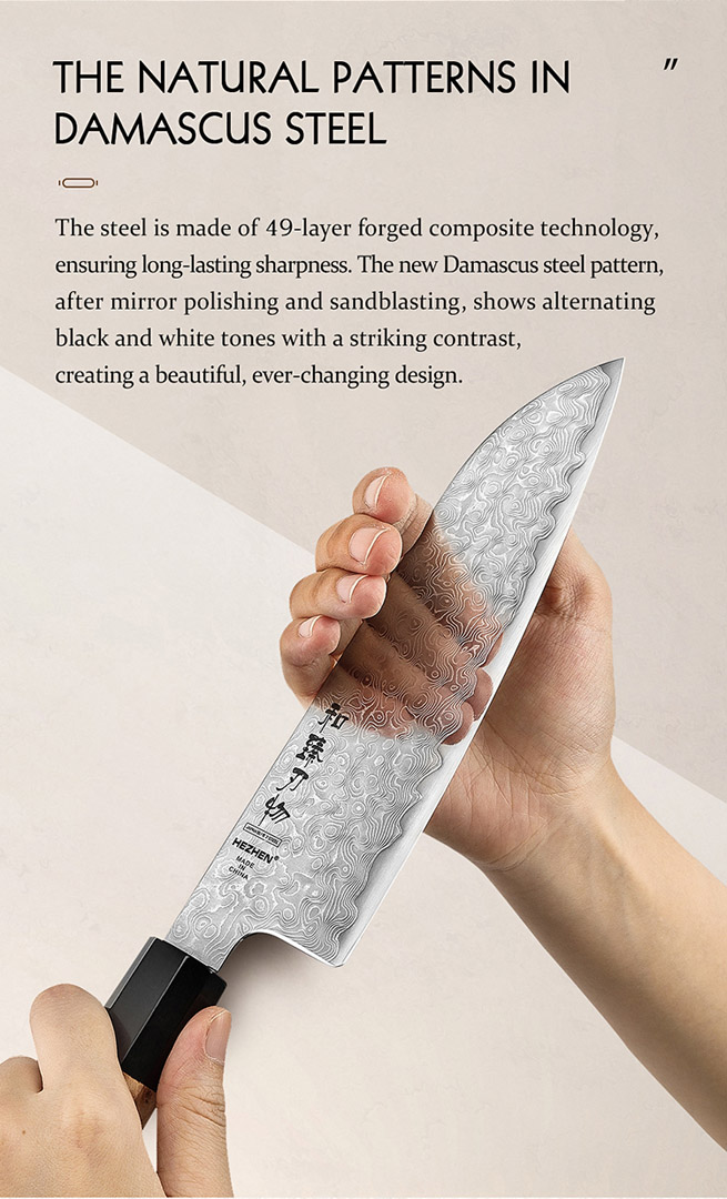 Die Klinge besteht aus 49 Lagen Damaststahl mit einem Kern aus Blue Steel No.2 – bekannt für seine außergewöhnliche Schärfe, Schnitthaltigkeit und Härte.