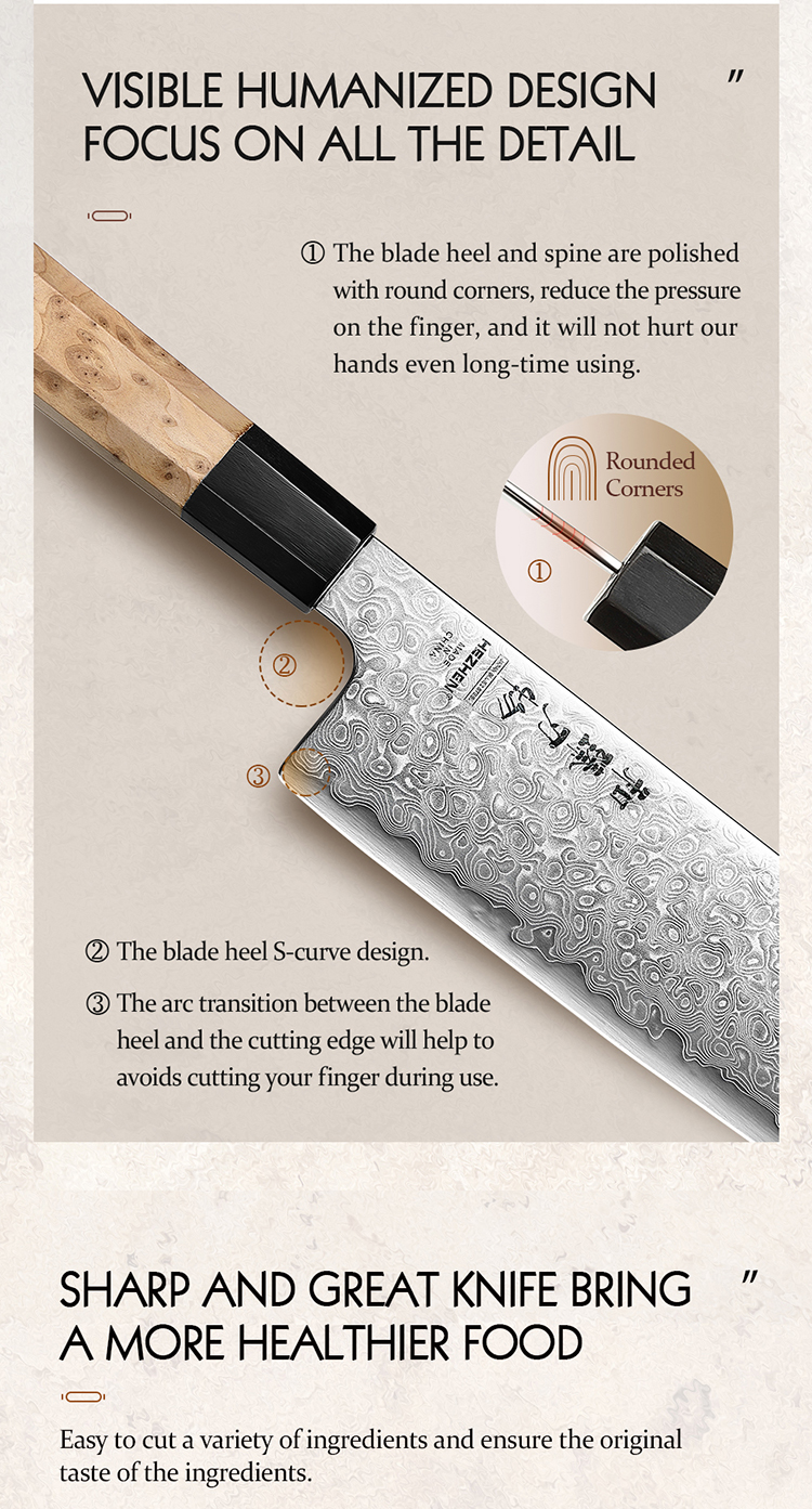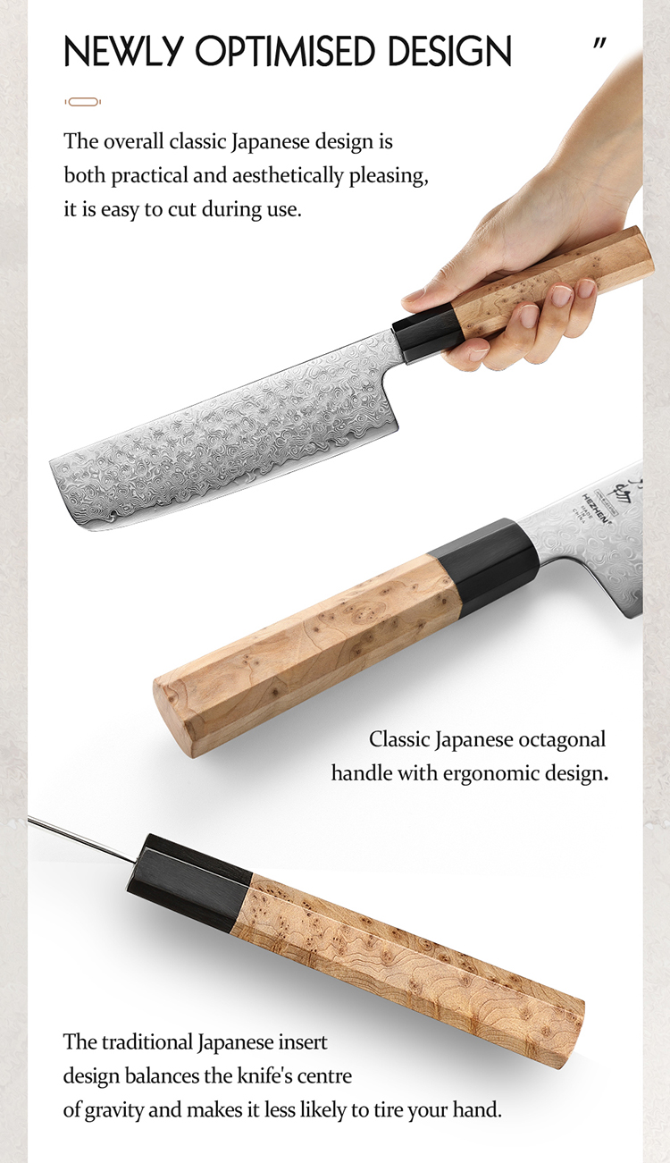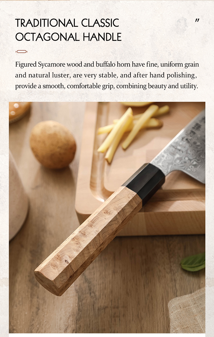 Hochwertiges Santokumesser mit 49-lagiger Damaststahlklinge und klassischem achteckigen Griff aus Sycamore-Holz – japanische Präzision trifft auf stilvolles Design.