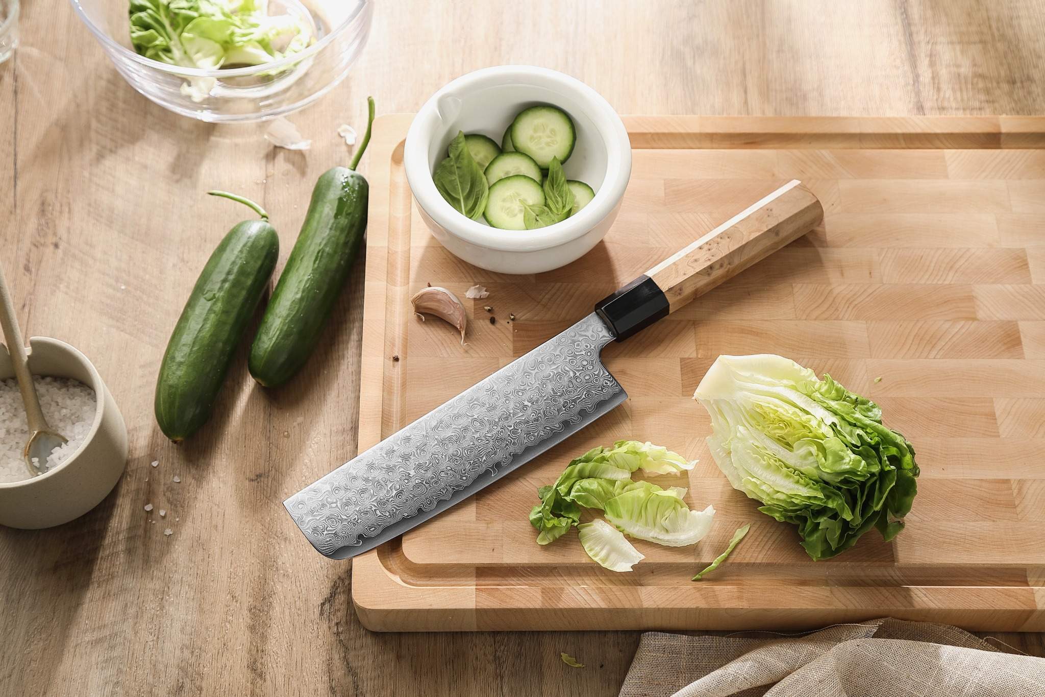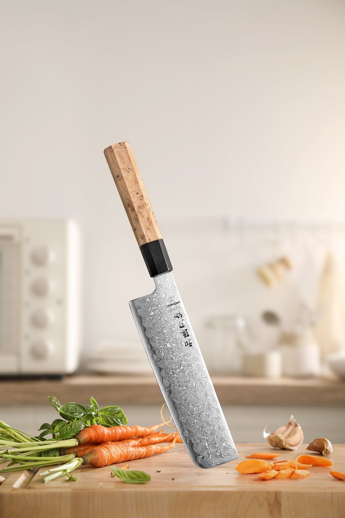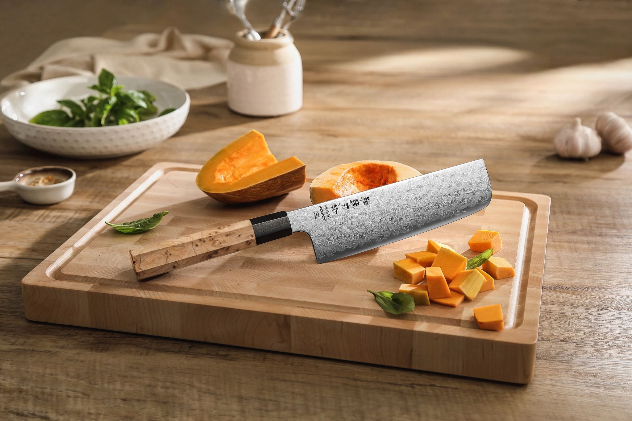 Hochwertiges Santokumesser mit 49-lagiger Damaststahlklinge und klassischem achteckigen Griff aus Sycamore-Holz – japanische Präzision trifft auf stilvolles Design.