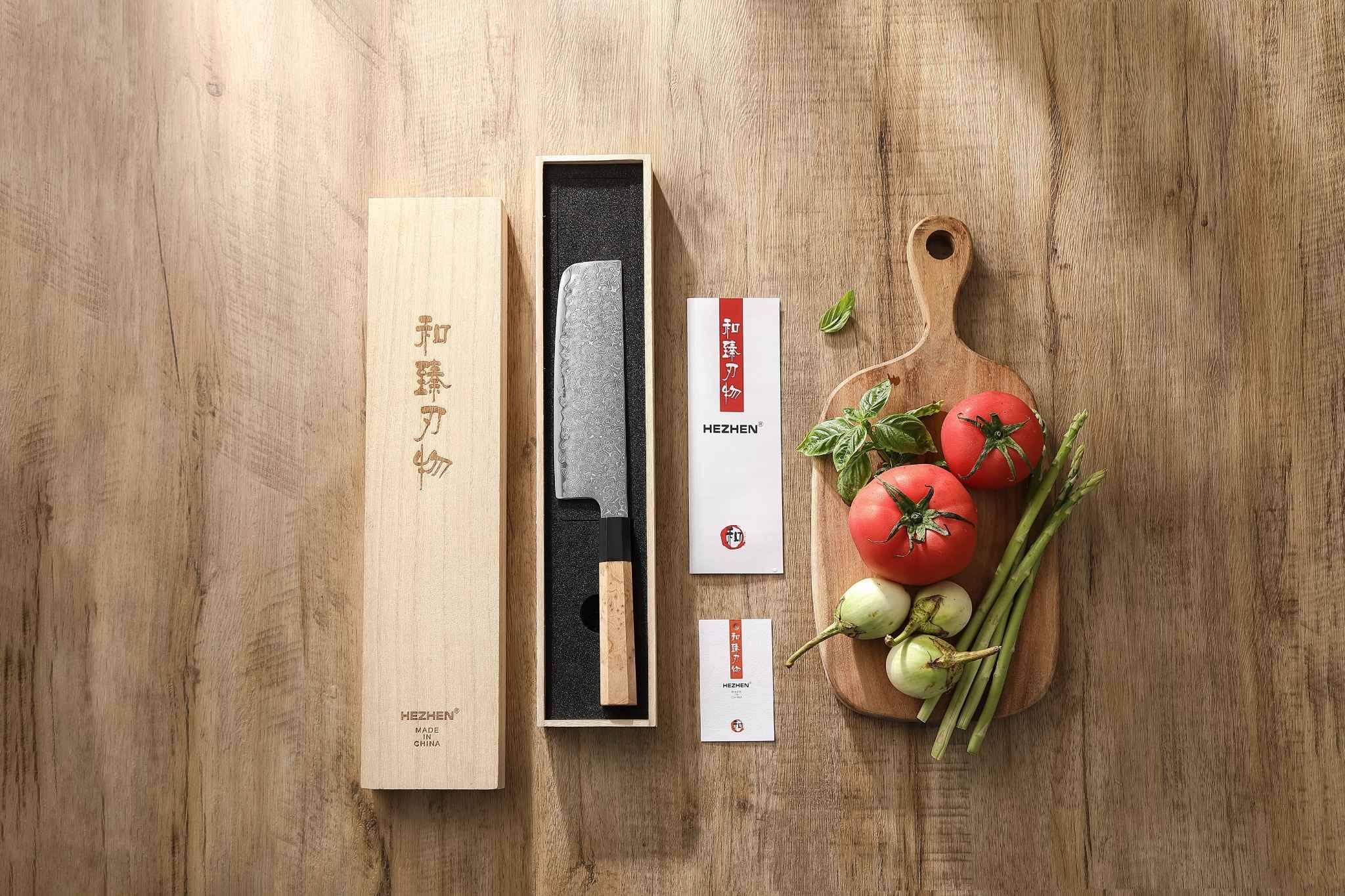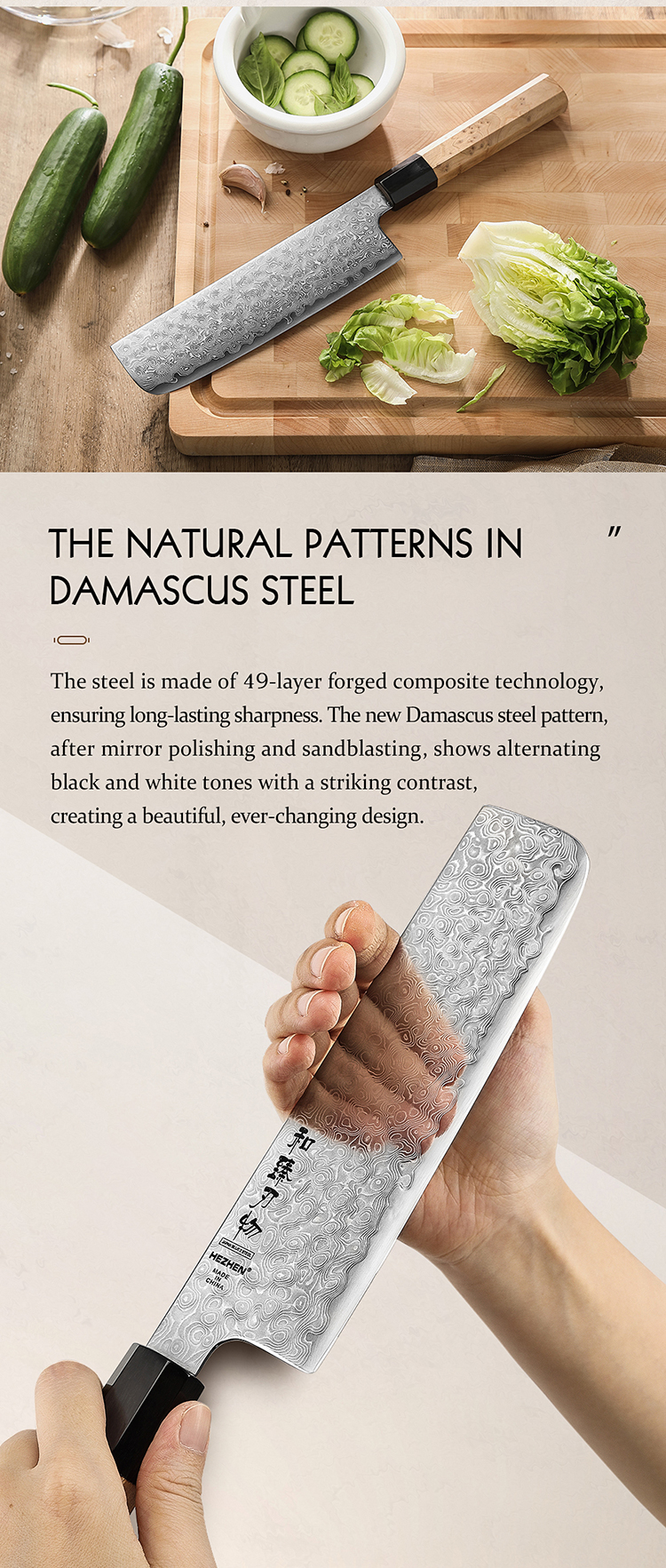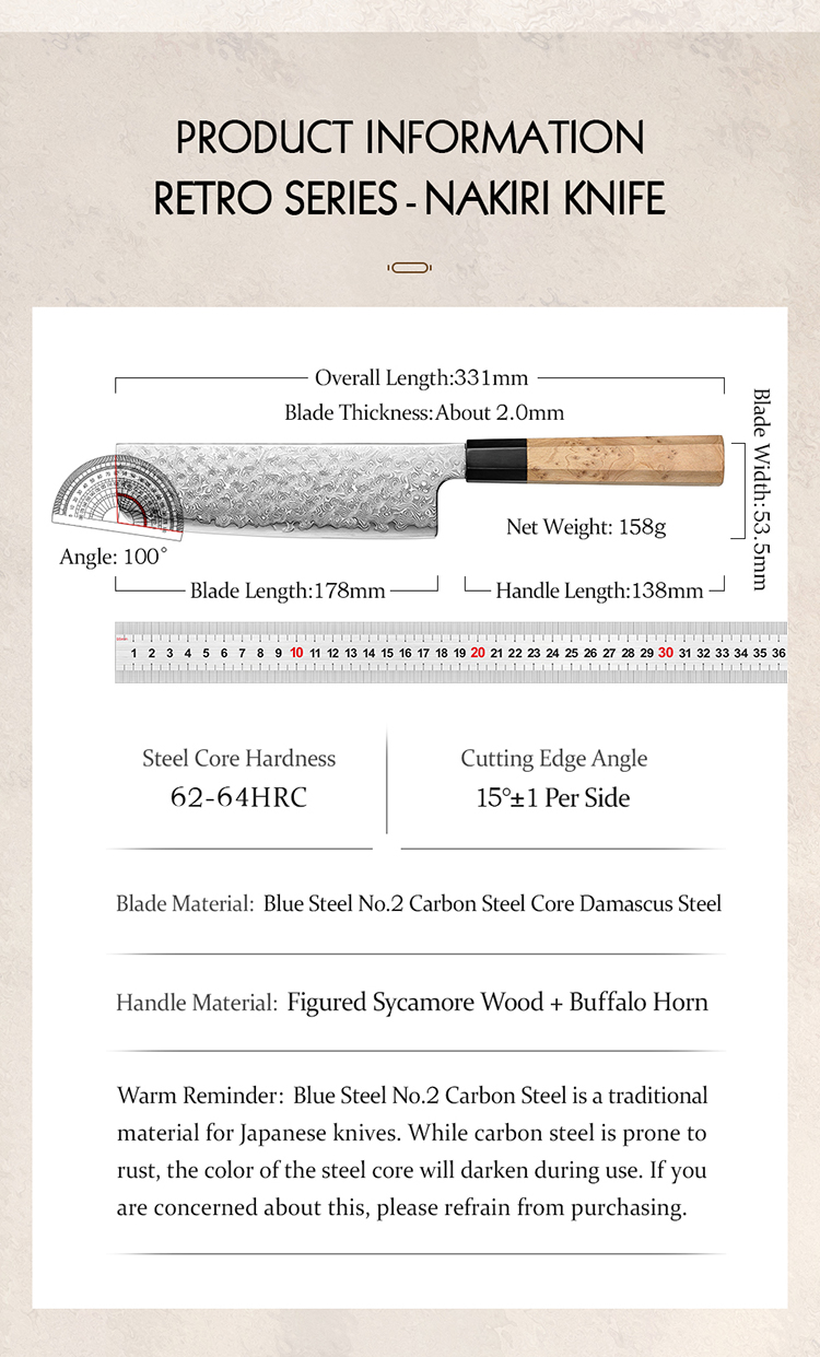 Die 49-lagige Damaststahlklinge mit einem Kern aus hochwertigem Blue Steel No.2 bietet außergewöhnliche Schärfe, Schnitthaltigkeit und eine beeindruckende Härte von 62–64 HRC.